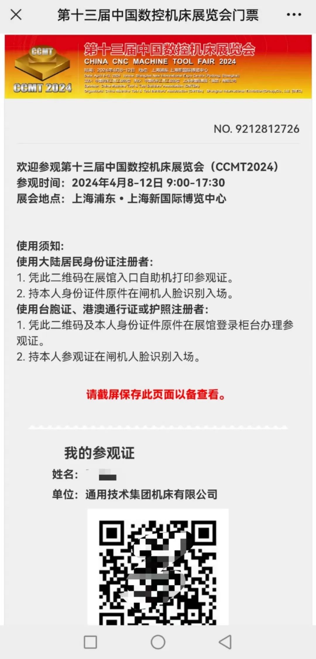 完成上述步驟,填寫(xiě)相關(guān)信息并提交,即可獲得展覽會(huì)電子門(mén)票。請(qǐng)截圖保存,或攜帶身份證原件到現(xiàn)場(chǎng)入口處核驗(yàn)。