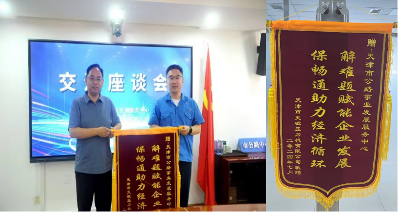 劉國福代表公司向市公路中心贈送錦旗,感謝市公路中心對天鍛公司有關(guān)工作的支持與幫助。趙文志代表市公路中心接受錦旗,感謝天鍛公司對市公路中心工作的認(rèn)可和鼓勵。